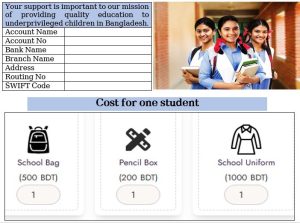 সকল শিশুর স্কুলে যাওয়ার, শেখার এবং বেড়ে ওঠার অধিকার আছে। আপনার সহযোগীতায় হতে পারে একজন সুবিধাবঞ্চিত শিশুর মানসম্মত শিক্ষা গ্রহনের সুযোগ।